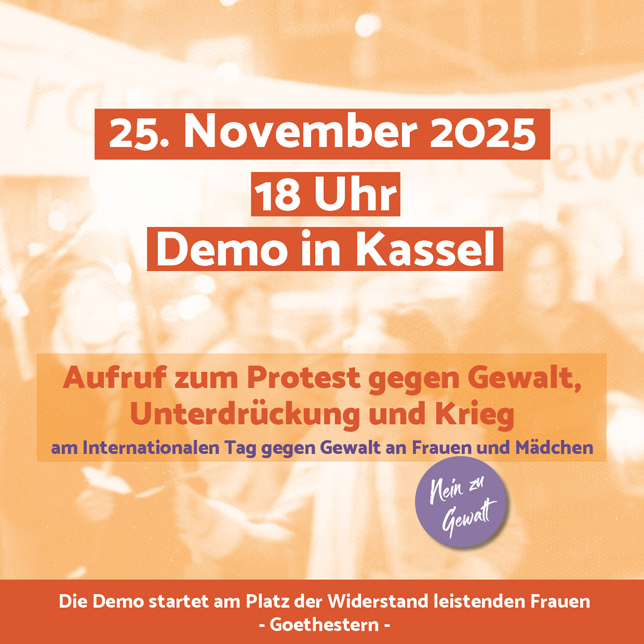 Am 25.11.2019 ab 16.30 h wird ein Protest- und Trauermarsch stattfinden, der auf die erschreckend hohe Zahl von Morden an Frauen in der BRD hinweisen will, ihnen gedenken und eine Stimme geben will und sich für eine effektive Bekämpfung von Gewalt gegen Frauen einsetzt. In der BRD wird jeden 2. Tag eine Frau weil sie eine Frau ist ermordet. Wir nennen dies nicht Beziehungs- oder Eifersuchtsdrama sondern Femizid. Gemeinsam mit vielen anderen Bewegungen weltweit setzen wir uns damit für eine Abschaffung von Gewalt gegen Frauen und die systematischen Morden an Frauen und ihren Kindern ein.Die Demonstration beginnt um 16.30 h Am Stern und führt über die Königsstraße zum RathausVeranstalterin: Frauenbündnis Kassel